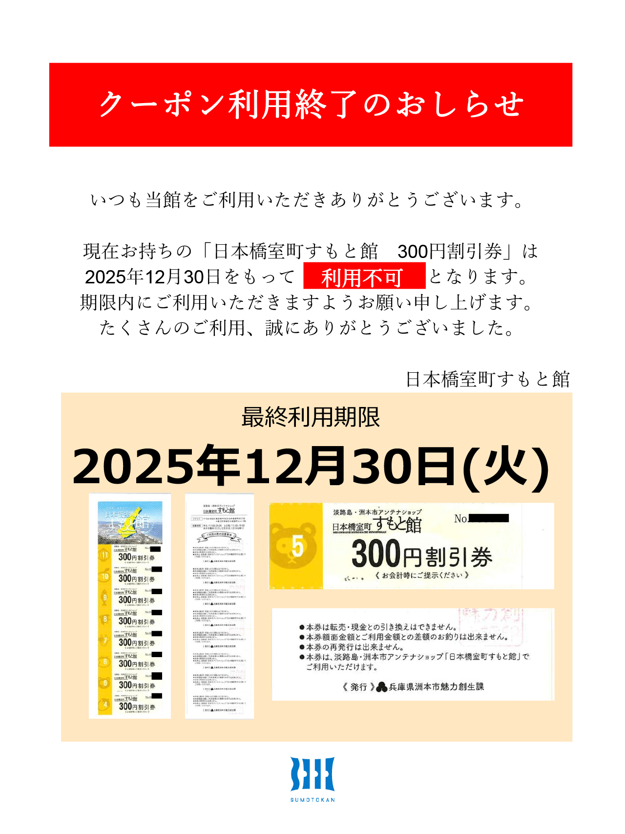 今後とも日本橋室町すもと館をご愛顧賜りますよう宜しくお願い申し上げます。
